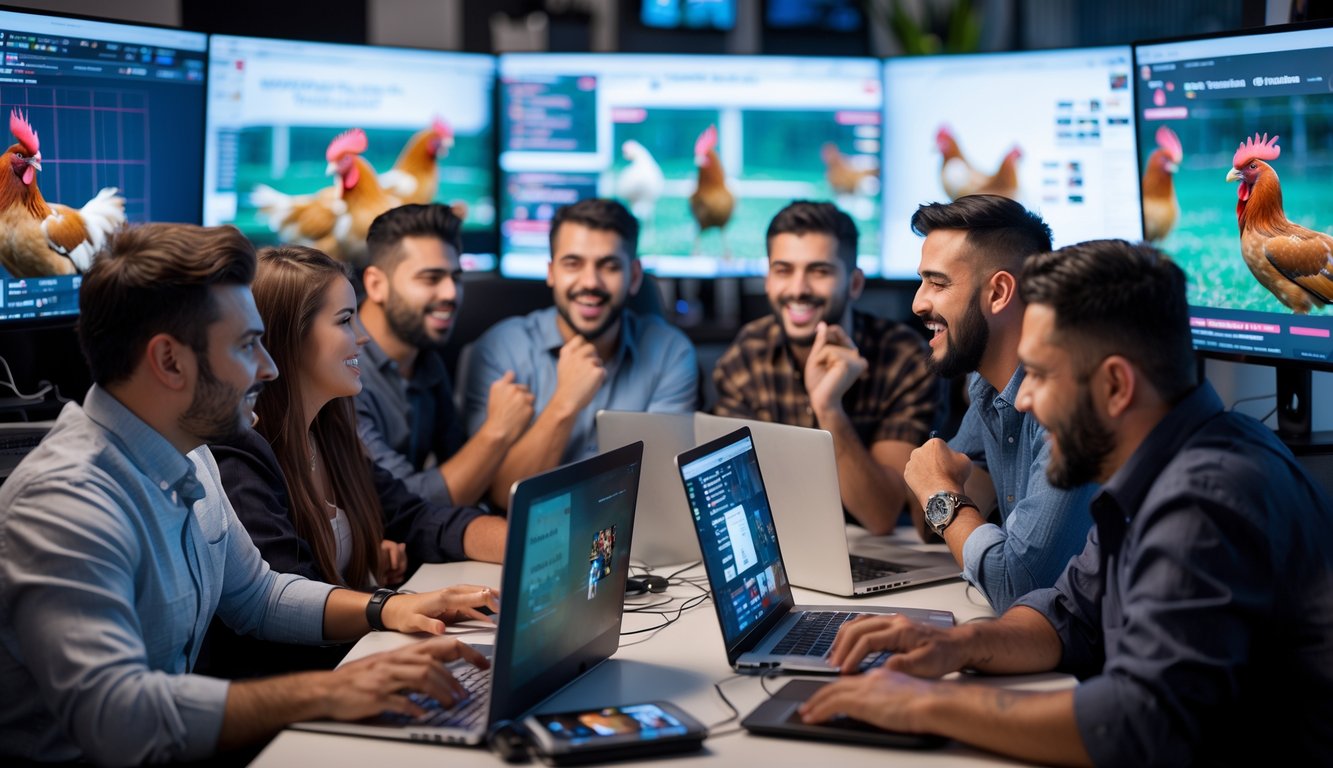 Sekelompok orang sedang berkumpul di depan komputer dan laptop, menonton dan berdiskusi tentang sabung ayam secara online.